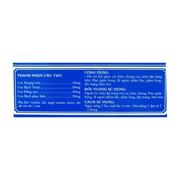 Phụ liệu: Gelatin, tale, magie stearate, lactose, bột săn visa đà 1 viên.