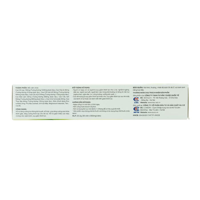 Phụ liệu: Lastose, tinh bột bắp, Magnesium stearate, Talc … vừa đủ