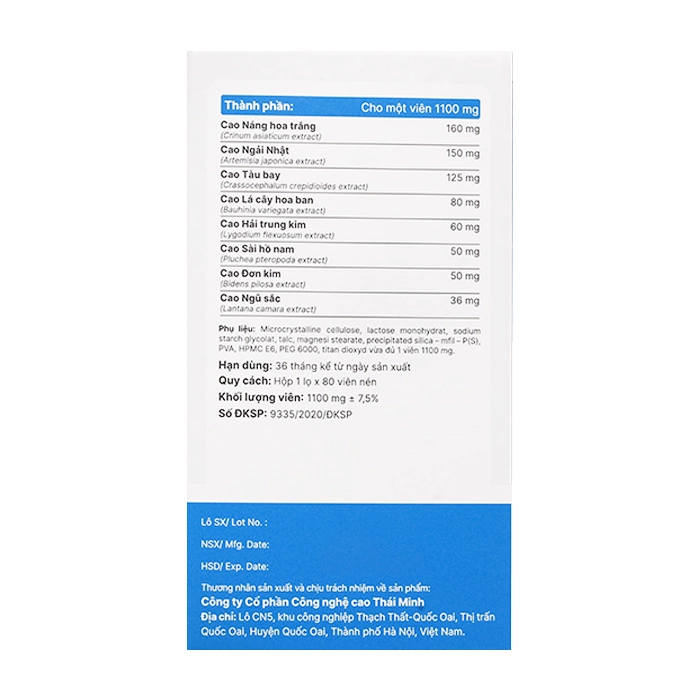 Phụ liệu: Microcrystalline cellulose, lactose monohydrat, sodium starch glycolat, talc, magnesi stearate, precipitated silica – mfil – P(S), PVA, HPMC E6, PEG 6000, titan dioxyd vừa đủ 1 viên 1100mg.
